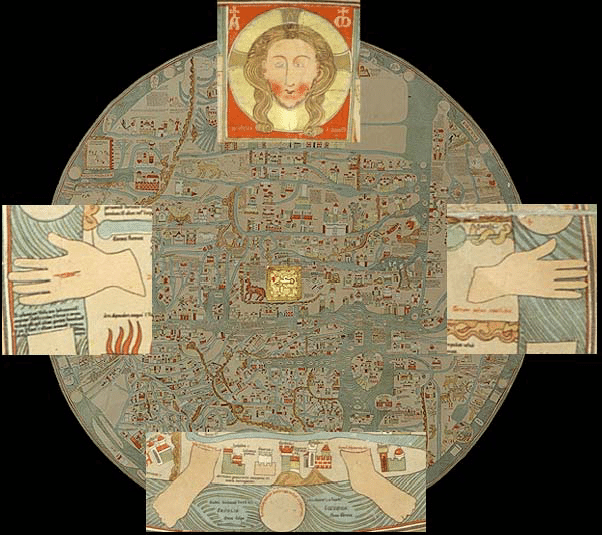 Equally fascinating are the map’s depictions of the celestial spheres and the heavenly hierarchy that governs the universe. Surrounding the Earth are the concentric circles of the heavens, inhabited by angels, saints, and celestial beings that oversee the workings of the cosmos. At the top of the map, Christ sits enthroned in glory, surrounded by the heavenly host, while below him are depictions of the zodiac, the planets, and the signs of the zodiac, each associated with cosmic significance and astrological symbolism.
